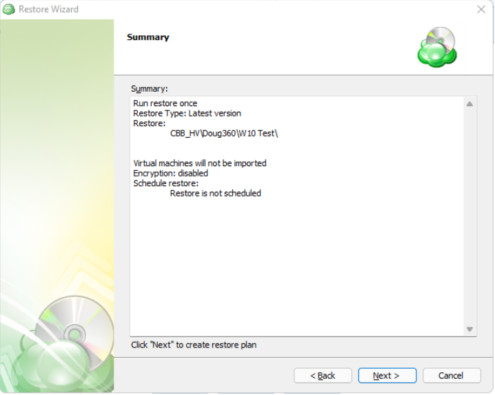With the correct type of restore selected, the application will generate a list of available backup plans to restore from.
