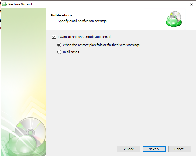 Enabling the Run missed scheduled restore immediately when computer starts up option will ensure that the restore plan will begin automatically after the computer starts up if it was unable to run at the scheduled time. This is only recommended for desktops and laptops. For servers, it is recommended that you run the restore plan manually when all maintenance works are completed to avoid adversely affecting server performance and internet bandwidth during working hours