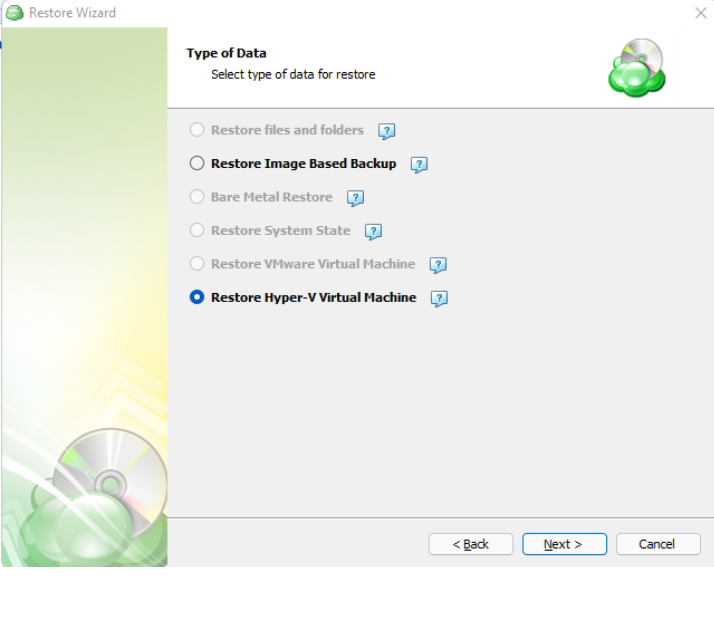 Next, you will be presented with a list of available backup types for the selected host. Select the Restore Hyper-V Virtual Machine option to continue.