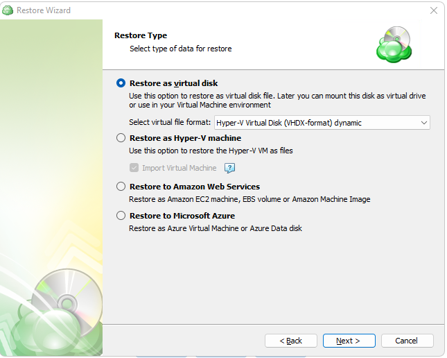 - Restore as Hyper-V machine: Selecting this option restores the virtual machine configuration as well as the virtual disks as files, but does not import the VM into the hypervisor by default.