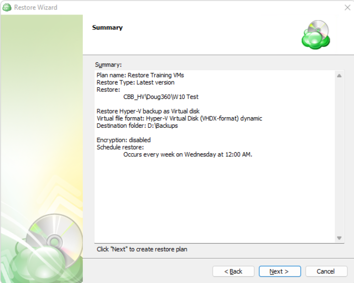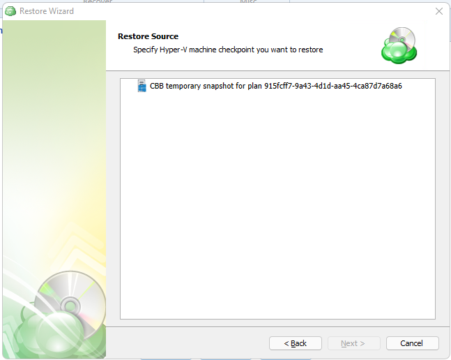 With the correct type of restore selected, the application will generate a list of available backup plans to restore from.