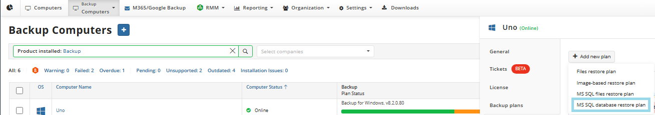Find the computer hosting the MS SQL instance to which you want to restore a previously backed up database or databases, then click the computer name or the Configure icon in the Backup Plan Status column.