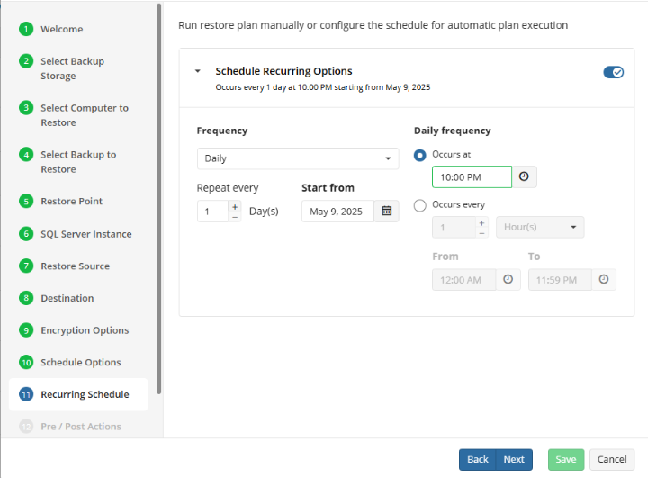 - No schedule (run manually): Use this option only when you wish to execute the Restore manually.
