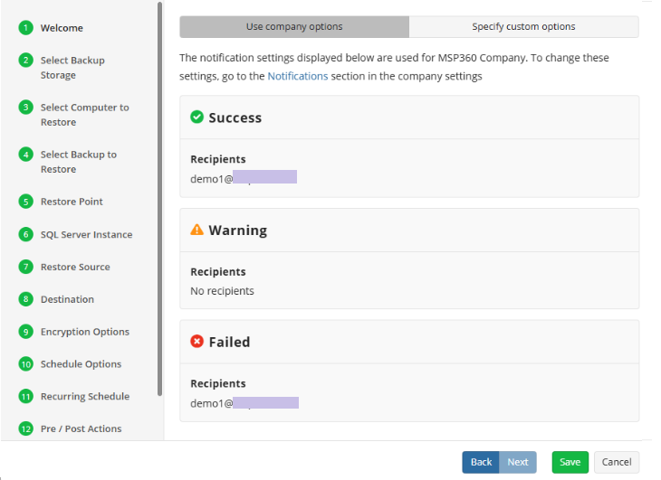 Enabling the Run missed scheduled restore immediately when computer starts up option will ensure that the restore plan will begin automatically after the computer starts up if it was unable to run at the scheduled time. This is only recommended for desktops and laptops. For servers, it is recommended that you run the restore plan manually when all maintenance works are completed to avoid adversely affecting server performance and internet bandwidth during working hours