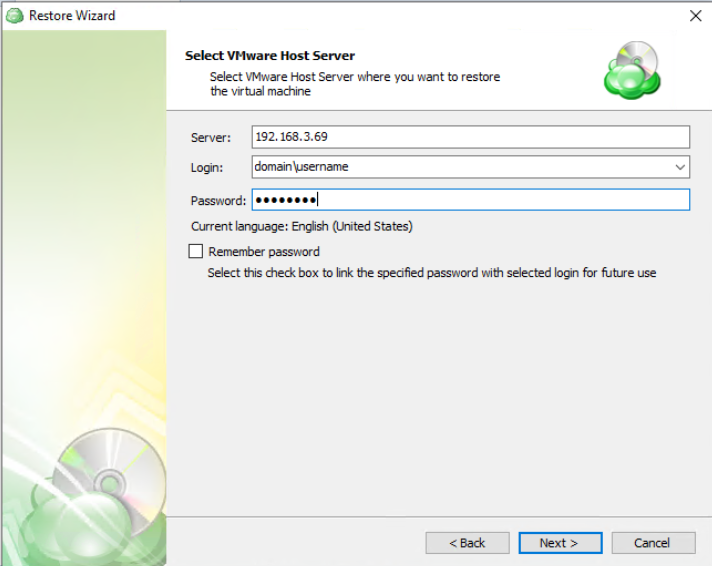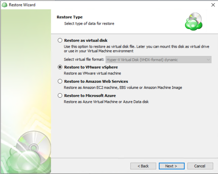 - Restore to VMware VSphere: Selecting this option restores the virtual machine configuration as well as the virtual disks to VSphere as a VM.