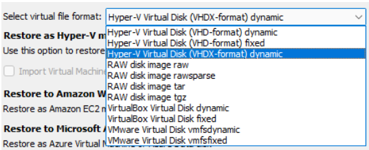 - Restore as virtual disk: Restores the virtual disks in the backup as a file which can later be mounted to a VM. No configuration files are included. Several formats are available: