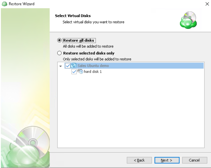 The next step is to select the disks to be restored.
