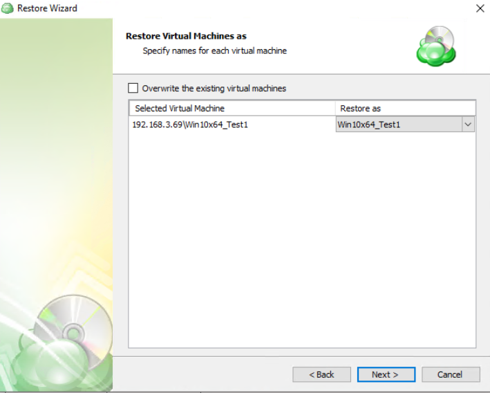 Next, you will be prompted to select which VM you would like to overwrite. If you wish to restore it as a different name or target VM, select or type over the value in the Restore as list.