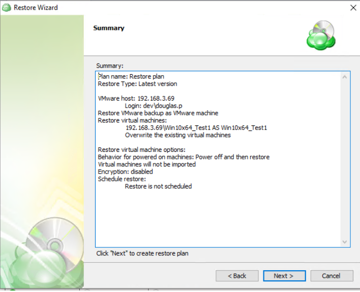 You can see the saved plan on the Restore Plans tab. If Run restore once was selected at the beginning of the wizard, the plan will immediately execute once you click Next.