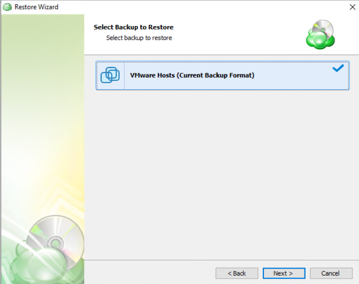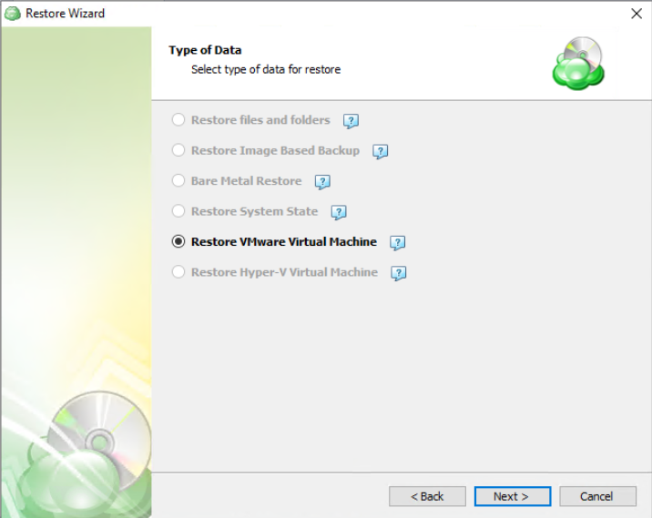 Next, you will be presented with a list of available backup types for the selected host. Select the Restore VMware Virtual Machine option to continue.